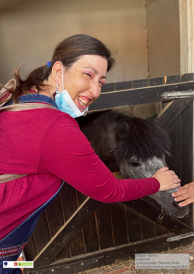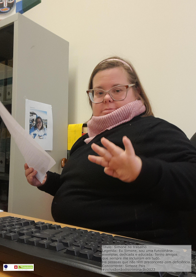 Legenda: Eu Simone, sou uma funcionária exemplar, dedicada e educada. Tenho amigos que sempre me incluiram em tudo. Há pessoas que não têm preconceito com deficiência.